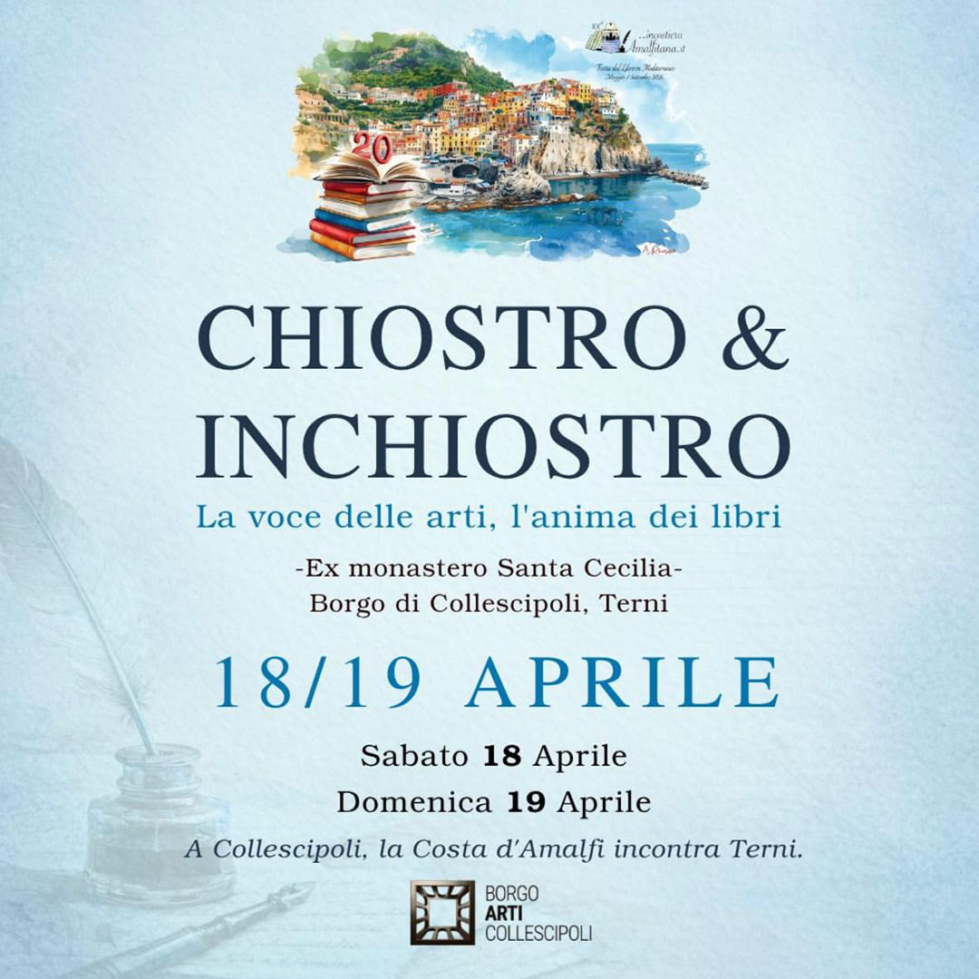 Nel suggestivo borgo umbro di Collescipoli, il 18 e 19 aprile prende vita “Chiostro e Inchiostro. La voce delle arti, l’anima dei libri”, un evento culturale dedicato all’incontro tra arti, letteratura e creatività. La manifestazione mette in dialogo il BAC - Borgo Arti Collescipoli con ...incostieraamalfitana.it Festa del Libro in Mediterraneo, anticipando ufficialmente la XX edizione della rassegna, in programma dall’8 maggio al 12 settembre 2026 lungo la Costa d’Amalfi.