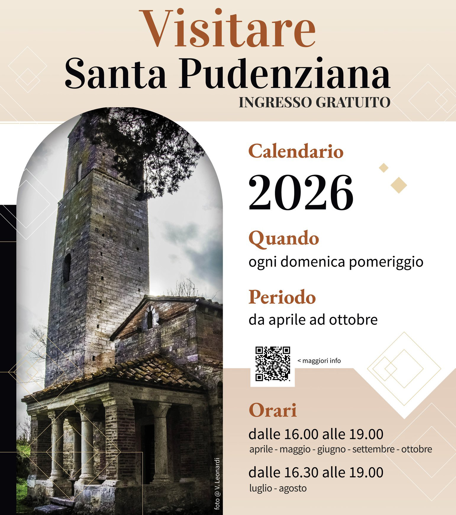 Le aperture si svolgeranno da aprile a ottobre, ogni domenica pomeriggio, con ingresso gratuito, grazie all’impegno dell’Associazione d’arte e cultura Santa Pudenziana.
